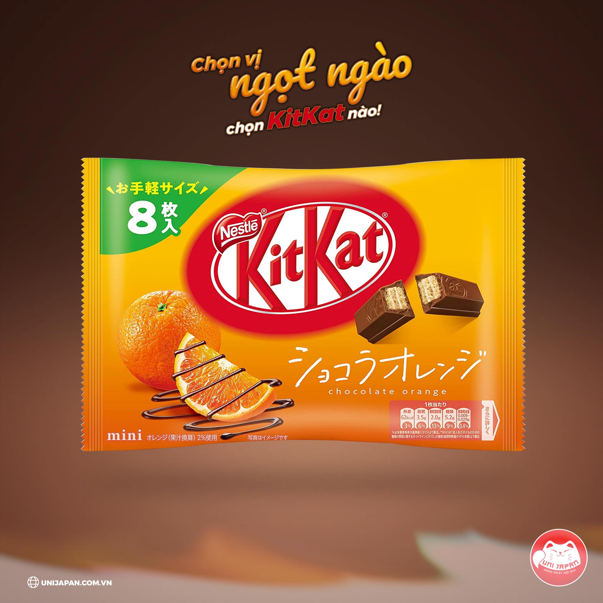 - Bánh Kitkat Mini Cam là sự kêt hợp giữa socola và vị cam, 100% tự nhiên, không hóa chất, hương thơm ngọt ngào của cam và sữa rất đặc trưng.
