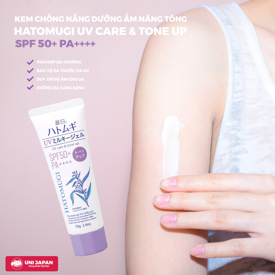 Kem Chống Nắng Hatomugi Nâng Tông, Dưỡng Ẩm Da 70g sản phẩm kem chống nắng đến từ thương hiệu mỹ phẩm Hatomugi của Nhật Bản, với độ chống nắng SPF 50+ PA++++ giúp bảo vệ da khỏi tia UVA, UVB, ngăn ngừa hình thành sạm nám da. Ngoài ra, sản phẩm chứa chiết xuất hạt ý dĩ, trái yuzu, lá hương thảo,... giúp cung cấp độ ẩm, dưỡng da sáng mịn, đều màu