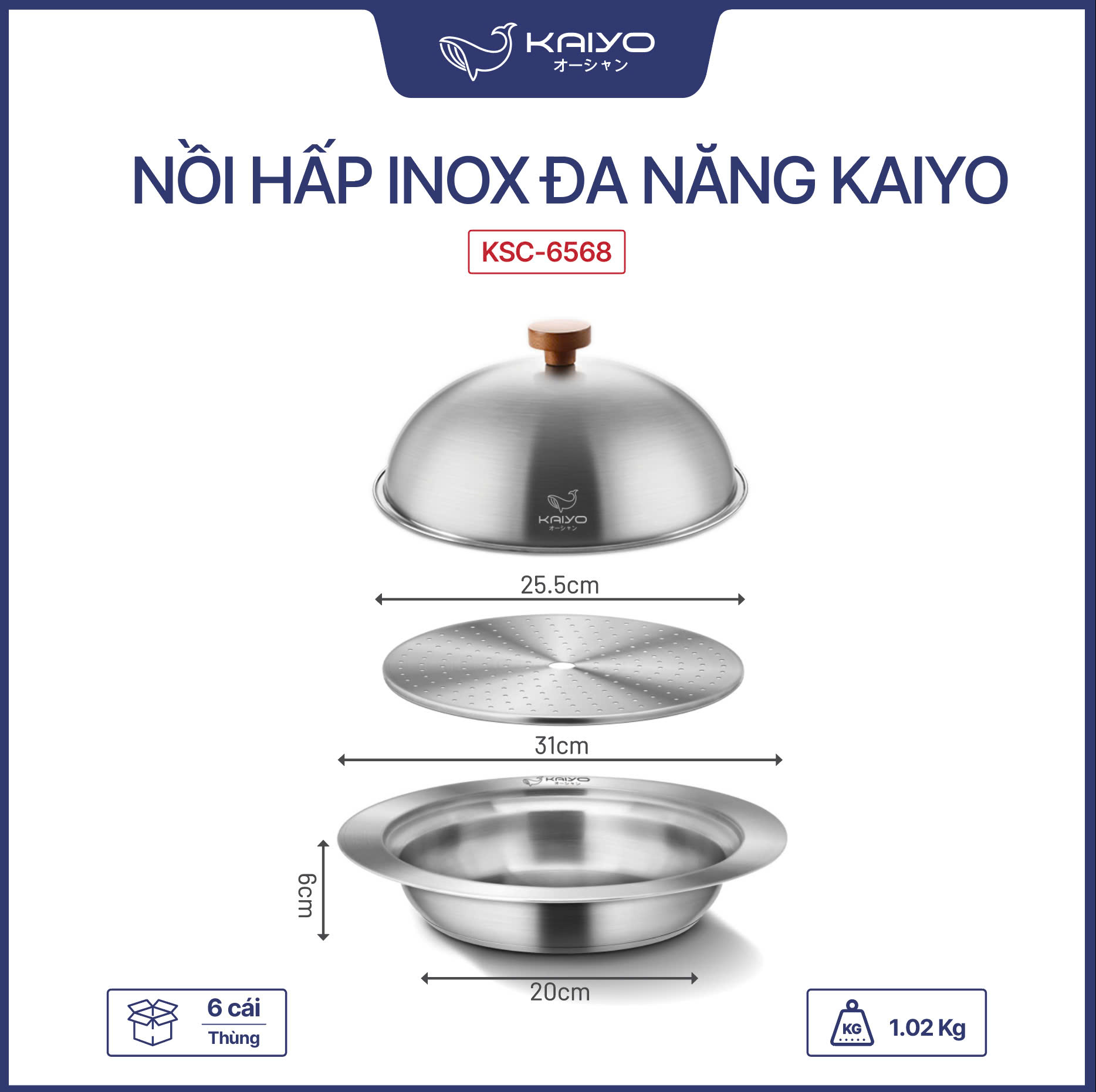 - Nồi hấp inox đa năng Kaiyo được thiết kế thông minh với miệng loe rộng, thành cao, nắp vòm đi kèm khay hấp đáp ứng đa năng các mục đích sử dụng: nồi hấp, nồi lẩu, hâm nóng đồ ăn... Toàn bộ nồi được làm từ chất liệu inox cùng thiết kế tiện dụng giúp nâng cao trải nghiệm nấu nướng và mang đến cho mỗi gia đình những bữa ăn đa dạng, nóng hổi, thơm ngon.