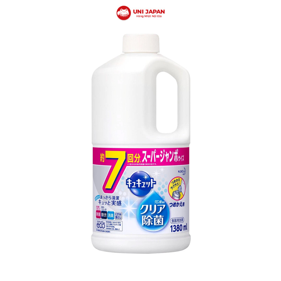 Sản phẩm nước rửa bát Kyukyuto diệt khuẩn 1380ml (màu trắng) của KAO rất đậm đặc, sau khi pha loãng có thể cho tới 18 lít nước rửa bát, dùng trong rửa bát, rửa rau củ, hoa quả, dụng cụ làm bếp hàng ngày.