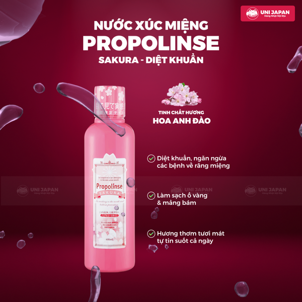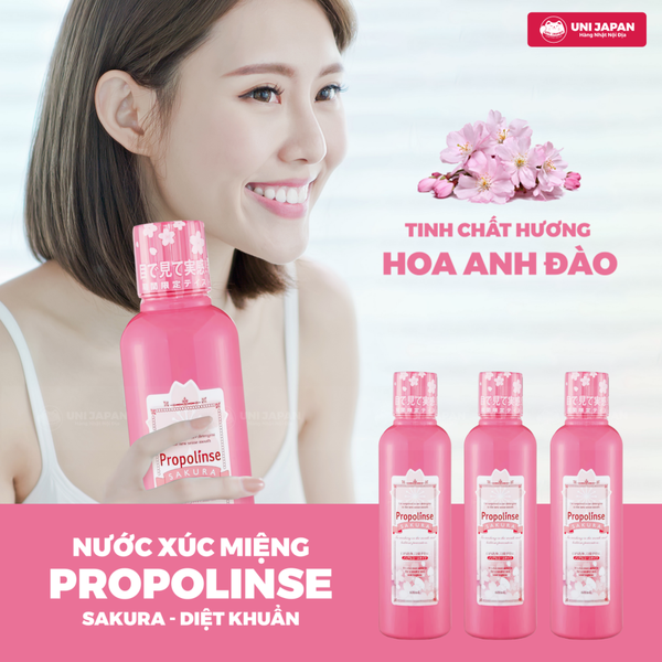 là phiên bản giới hạn được sản xuất với số lượng giới hạn cho mùa xuân. Nước súc miệng Propolinse Nhật Bản Sakura được bổ sung thêm chiết xuất hương hoa anh đào mang cả hương vị Nhật vào hơi thở của bạn với hương hoa dễ chịu, ngăn ngừa hôi miệng tuyệt đối.