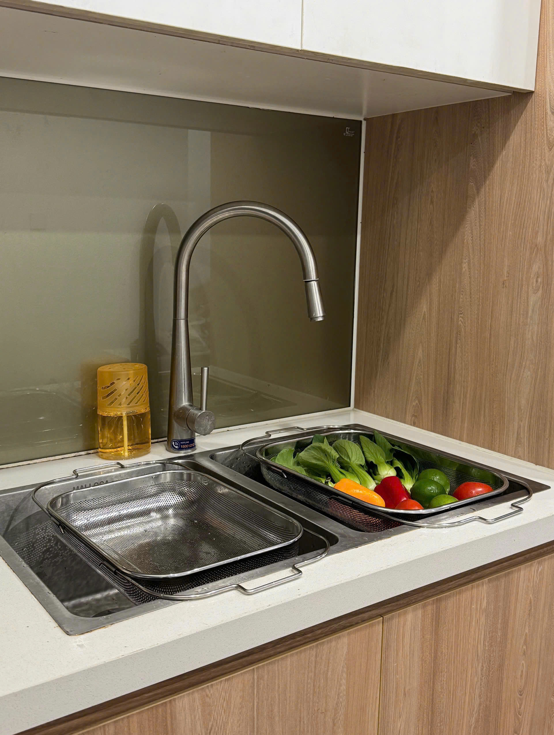 Tiết kiệm diện tích: Tận dụng không gian phía trên bồn rửa, giúp căn bếp gọn gàng, ngăn nắp hơn.