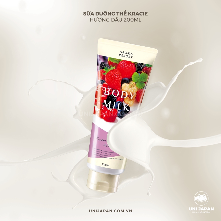 - Sữa dưỡng thể Hương Dâu Kracie Hương Dâu 200mlgiúp làm mờ các vết thâm nám, đốm nâu, giúp da sáng đều màu, phục hồi làn da cháy nắng.