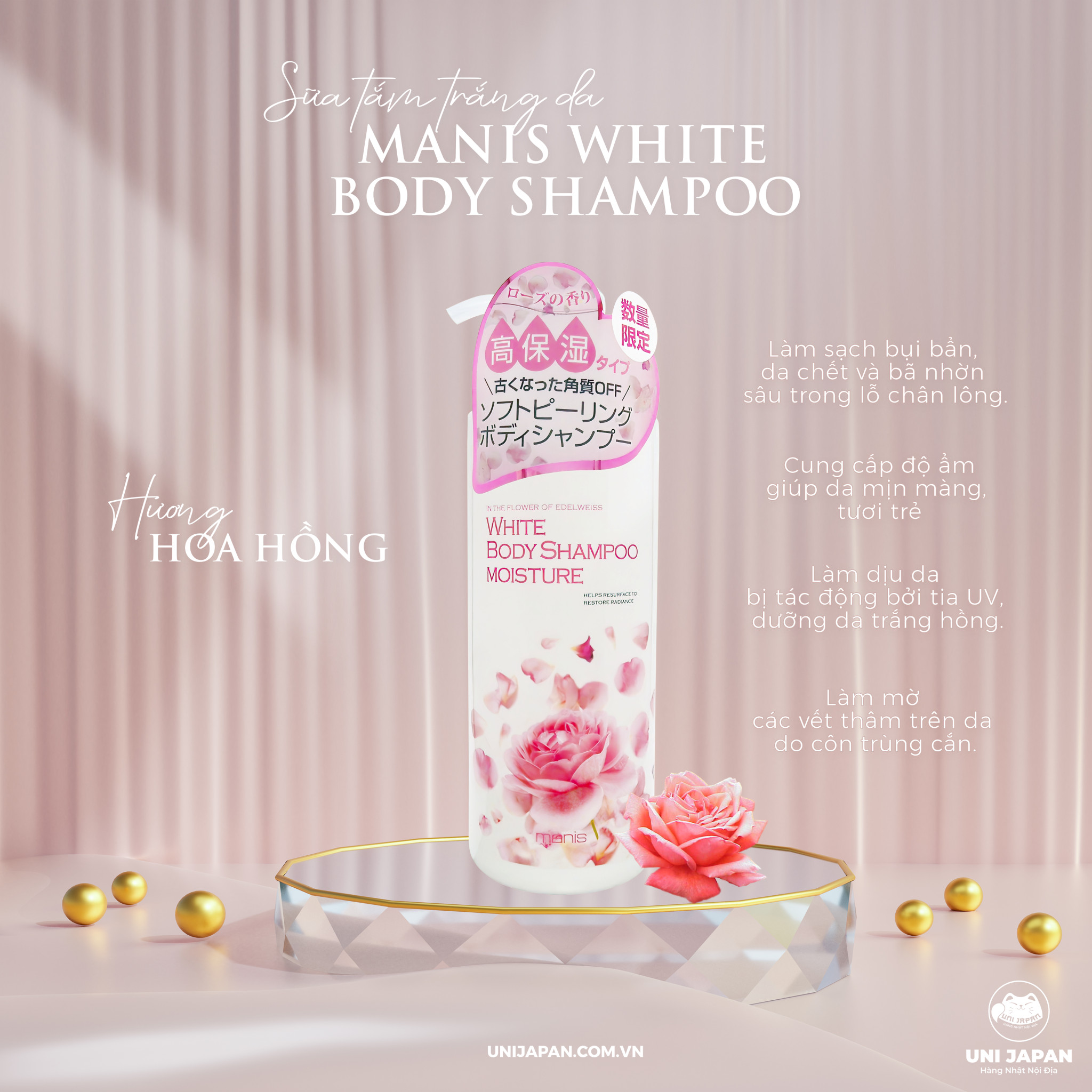 Sữa tắm Manis White Body Shampoo Moisture phiên bản mùi hoa hồng quyến rũ rất được yêu thích. Sữa tắm chứa nhiều thành phần dưỡng chất giúp làm sáng da, cải thiện vết thâm, cháy nắng, sần sùi thô ráp,... cho toàn thân mịn màng, tươi sáng