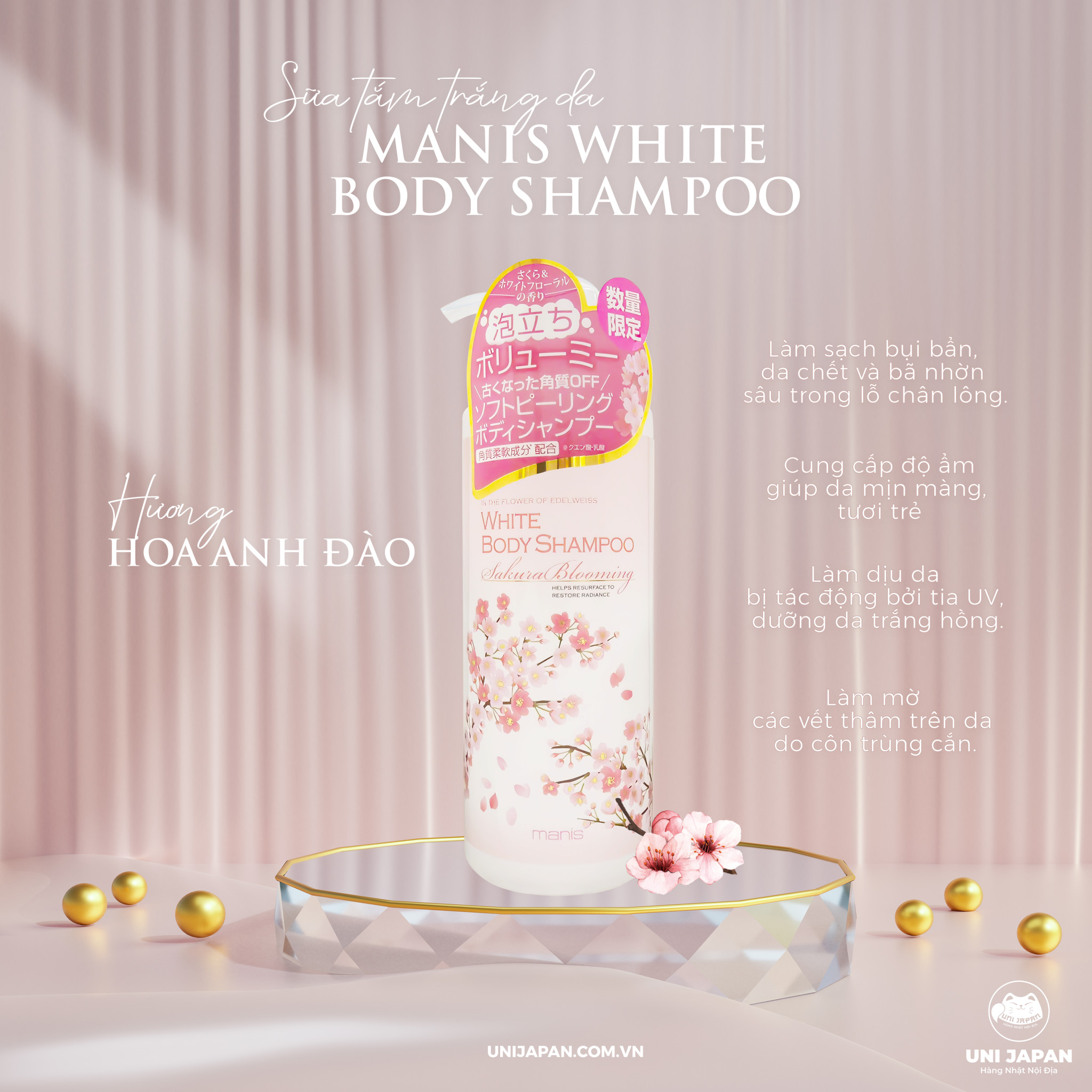Sữa tắm Manis White Body Shampoo – Sakura Blooming là phiên bản mới nhất của dòng sữa tắm Manis trắng da. Sản phẩm mang đến hương thơm từ hoa Anh Đào Sakura, kết hợp với White Floral. Với tinh chất Hoa Anh Đào giúp nuôi dưỡng da sáng khoẻ, mịn màng, hỗ trợ loại bỏ tế bào chết trên da hiệu quả. Sử dụng White Body Shampoo Sakura Blooming sẽ giúp nâng tone da nhẹ nhàng, hiệu quả, giúp cảm nhận làn da sáng hồng hào hơn, đồng thời mang đến hương thơm dễ chịu từ hoa Anh Đào.