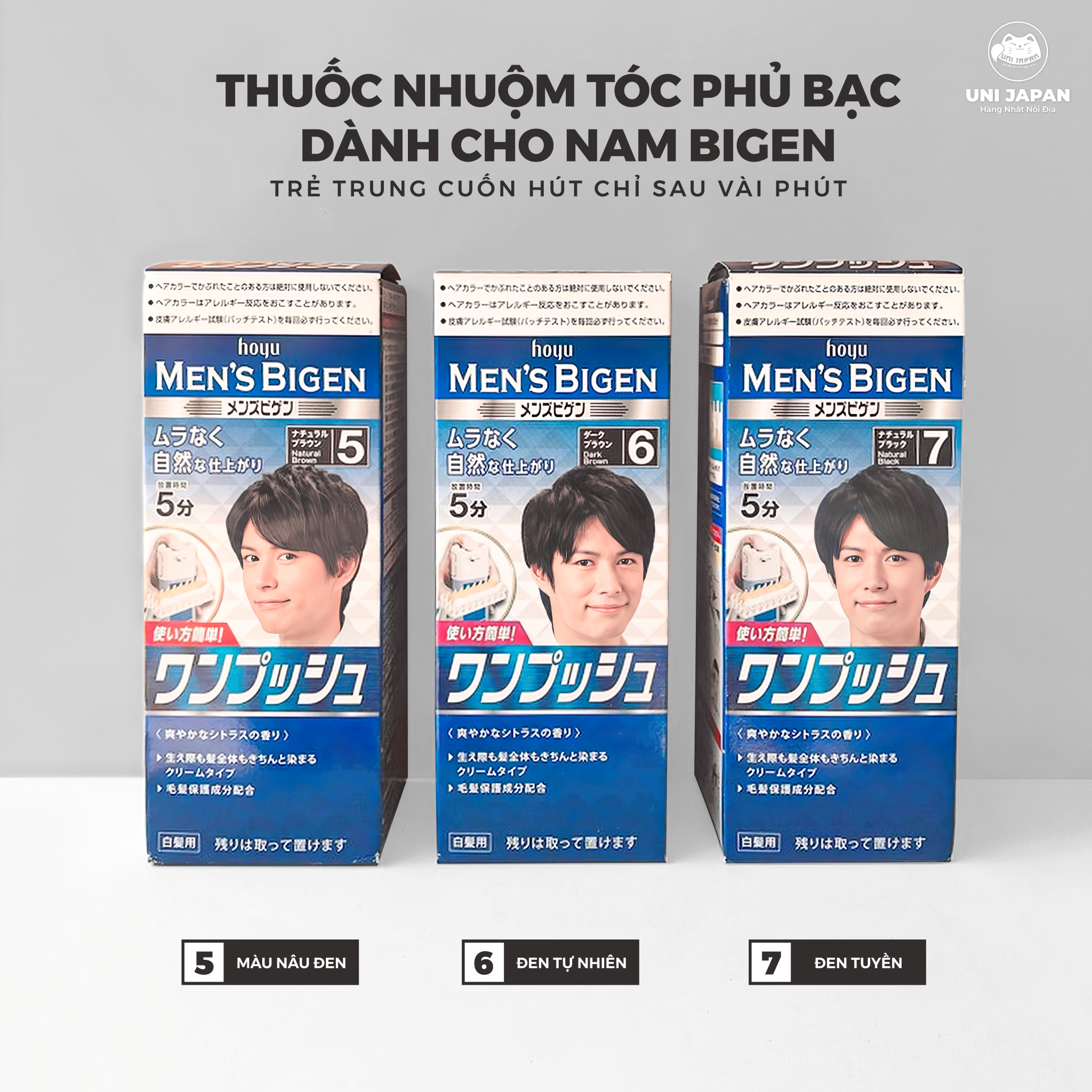 Nhuộm tóc phủ bạc nam MEN'S BIGEN là tốt số 1 của dòng sản phẩm của thương hiệu BIGEN thuộc hãng HOYU Nhật Bản. Sản phẩm với kỹ thuật nhuộm đơn giản, giúp người nhuộm không cần phải rành kỹ thuật nhuộm, không cần phải trộn thuốc mà vẫn có thể tự nhuộm cho mình một cách dễ dàng. Bạn chỉ cần 3 bước Bấm - Chải - Gội là đã có mái tóc tươi trẻ như ý.