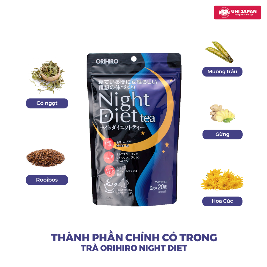 Trà giảm cân Orihiro Night Diet Tea có thành phần 100% từ các loại thảo dược thiên nhiên, được sản xuất tại nhà máy đạt chứng nhận GMP, không chứa chất phụ gia, chất bảo quản, Cafein giúp đốt cháy lượng mỡ thừa ngay cả khi ngủ.