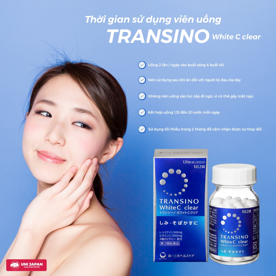 Viên uống trắng da Transino White C Clear đến từ thương hiệu trị nám da hàng đầu Nhật Bản được nhiều chị em phụ nữ Châu Á tin dùng. Sản phẩm là sự kết hợp của Vitamin C, L-cysteine, 4 loại vitamin tổng hợp giúp ngăn ngừa trị nám hiệu quả, mang lại làn da trắng sáng mịn màng.