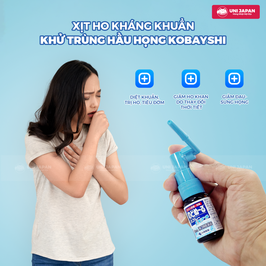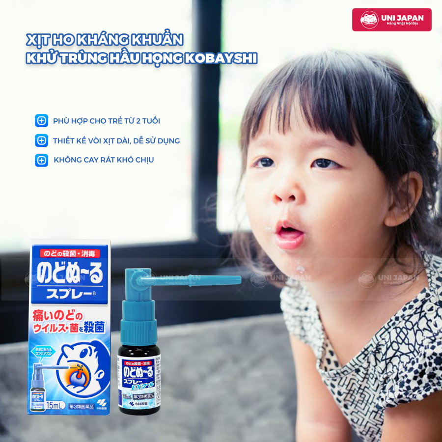 Xịt họng trị ho Kobayashi 15mL hỗ trợ tại chỗ các chứng viêm và nhiễm trùng thứ phát có giới hạn ở vùng xoang miệng và vùng hầu họng. Thiết kế vòi phun dài dễ dàng đưa thuốc vào sâu trong vùng họng, khử trùng và tiêu diệt vi khuẩn gây viêm họng.