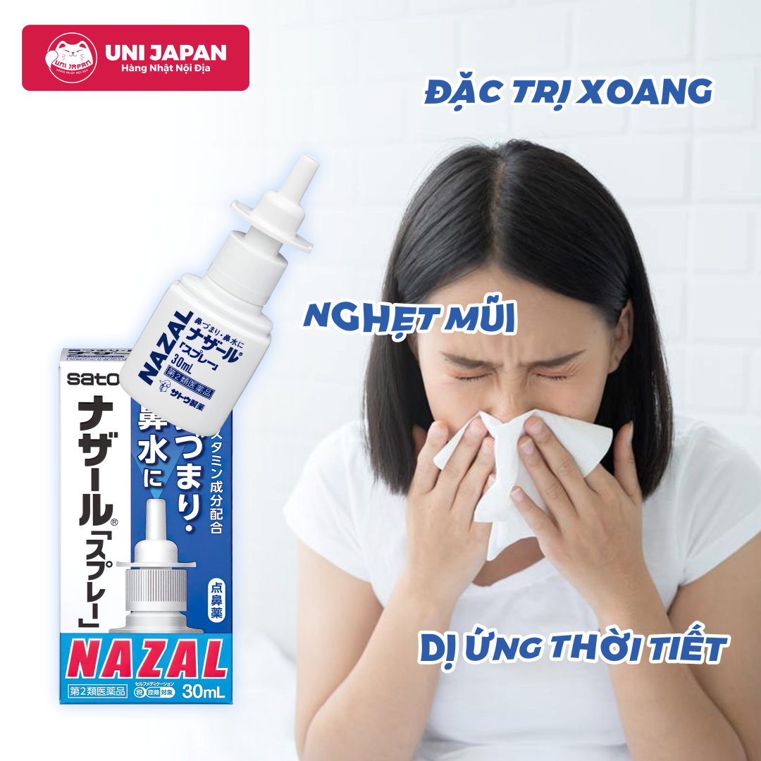 Xịt mũi Sato Nazal 30ml giúp làm giảm viêm mũi dị ứng gây ra bởi viêm xoang hoặc cảm cúm: Sổ mũi, nghẹt mũi, chảy nước mũi, hắt hơi liên tục, ngứa rát khó chịu.
